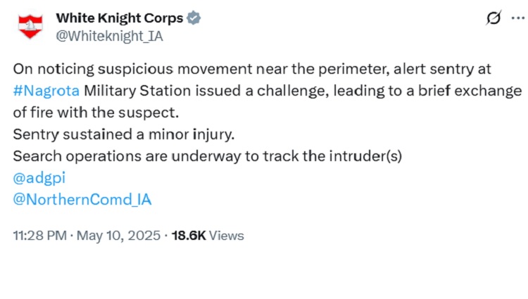 सेना की व्हाइट नाइट कोर ने घटना की पुष्टि करते हुए बताया कि संदिग्ध की तलाश में इलाके में बड़े पैमाने पर तलाशी अभियान जारी है। कोर ने सोशल मीडिया प्लेटफॉर्म ‘एक्स’ पर बताया, “सैन्य स्टेशन की परिधि पर संदिग्ध गतिविधि दिखने पर संतरी ने चुनौती दी, जिसके बाद फायरिंग हुई। जवान को हल्की चोट लगी है। सघन तलाशी अभियान जारी है।”